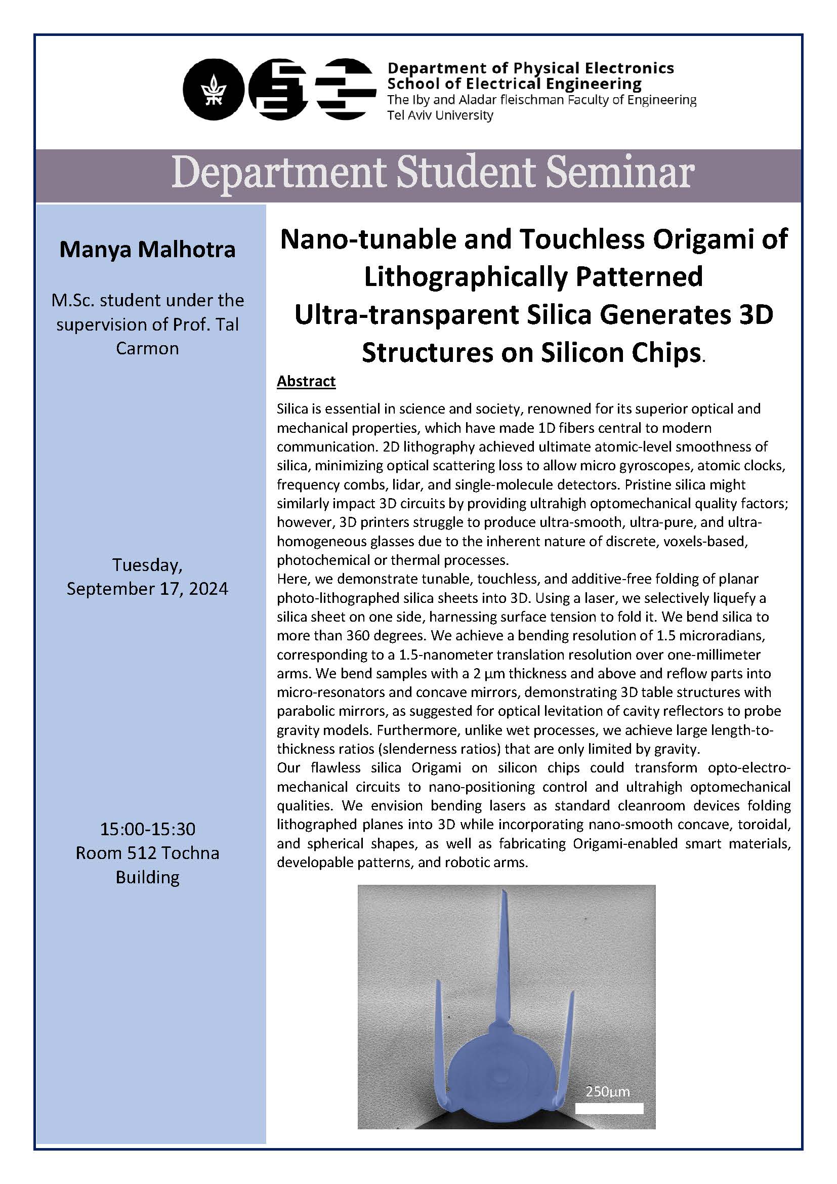 Physical Electronics Seminar -INano-tunable and Touchless Origami of Lithographically Patterned Ultra-transparent Silica Generates 3D Structures on Silicon Chips
